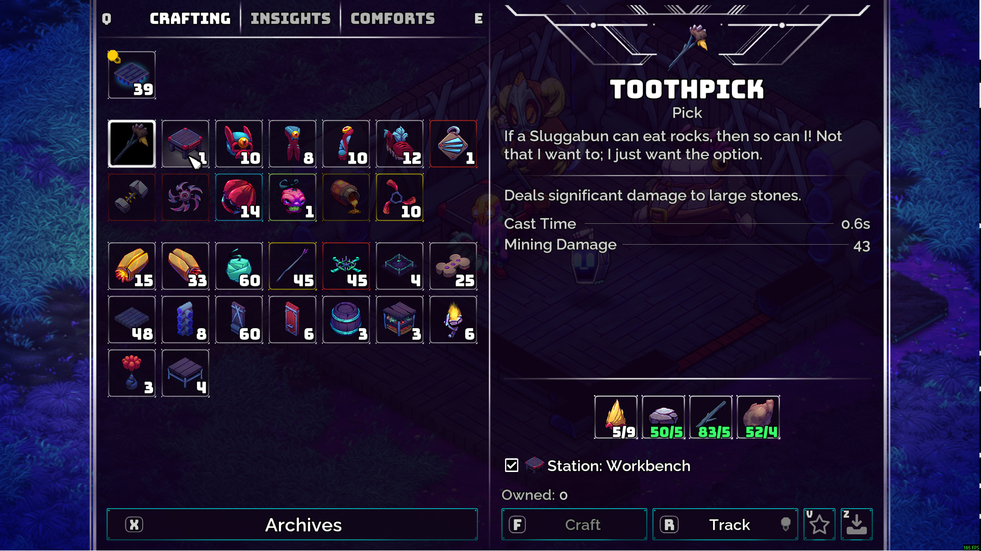 Crashlands 2 is humorous and offers hours of gameplay, but be aware that it is very grindy. There are various resources to gather, recipes to learn and research, structures and items to build, and many fetch quests that require the player to run back and forth over the map. Research takes a bit of time. Fortunately, you can gather resources while waiting to finish researching an item. Unfortunately, there are often multiple items that need to be researched one after the other so you will spend a lot of time wandering around looking for materials and running back to your workbench. In fact, I spent a good amount of time killing Sluggaballs just to get enough Sluggacisors just to craft a toothpick. Granted, this toothpick breaks rocks but obtaining enough Sluggacisors took far more time than it should have, especially considering I was in exploration mode.