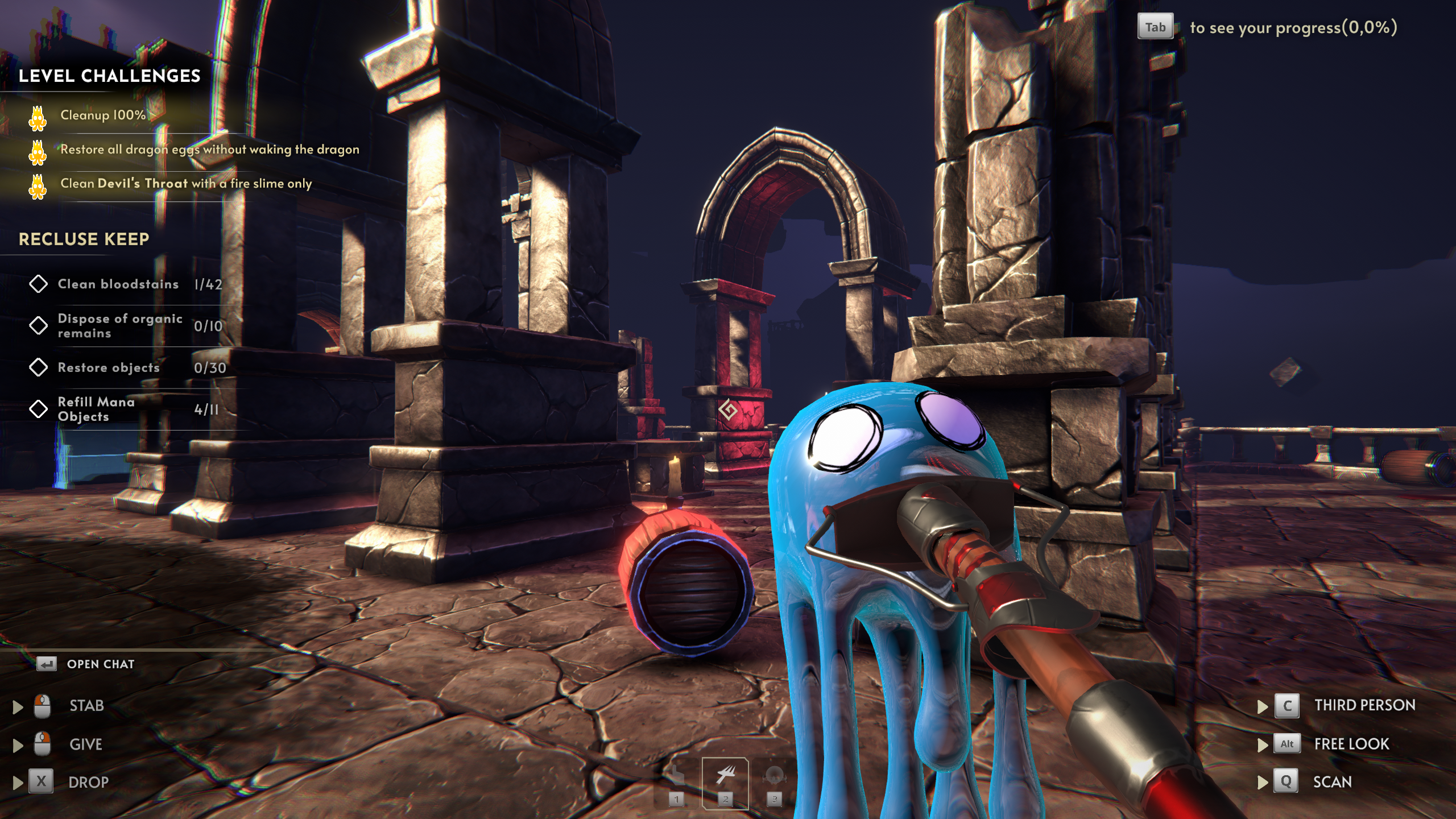 And it’s special too! Let’s talk about the game basics. So, you take your mop… wait, what mop? Pff… there is no mop! Okay, one more try, you take your Slimop! It looks like a trident, and all you have to do is walk up to the big slime machine, press a lever, stab the slime with it and boom, you have got your Slimop. Easy, right? With your Slimop you can clean a blood, and after it became too dirty, all you do is putting your dirty bloody slime inside of a Mimic.