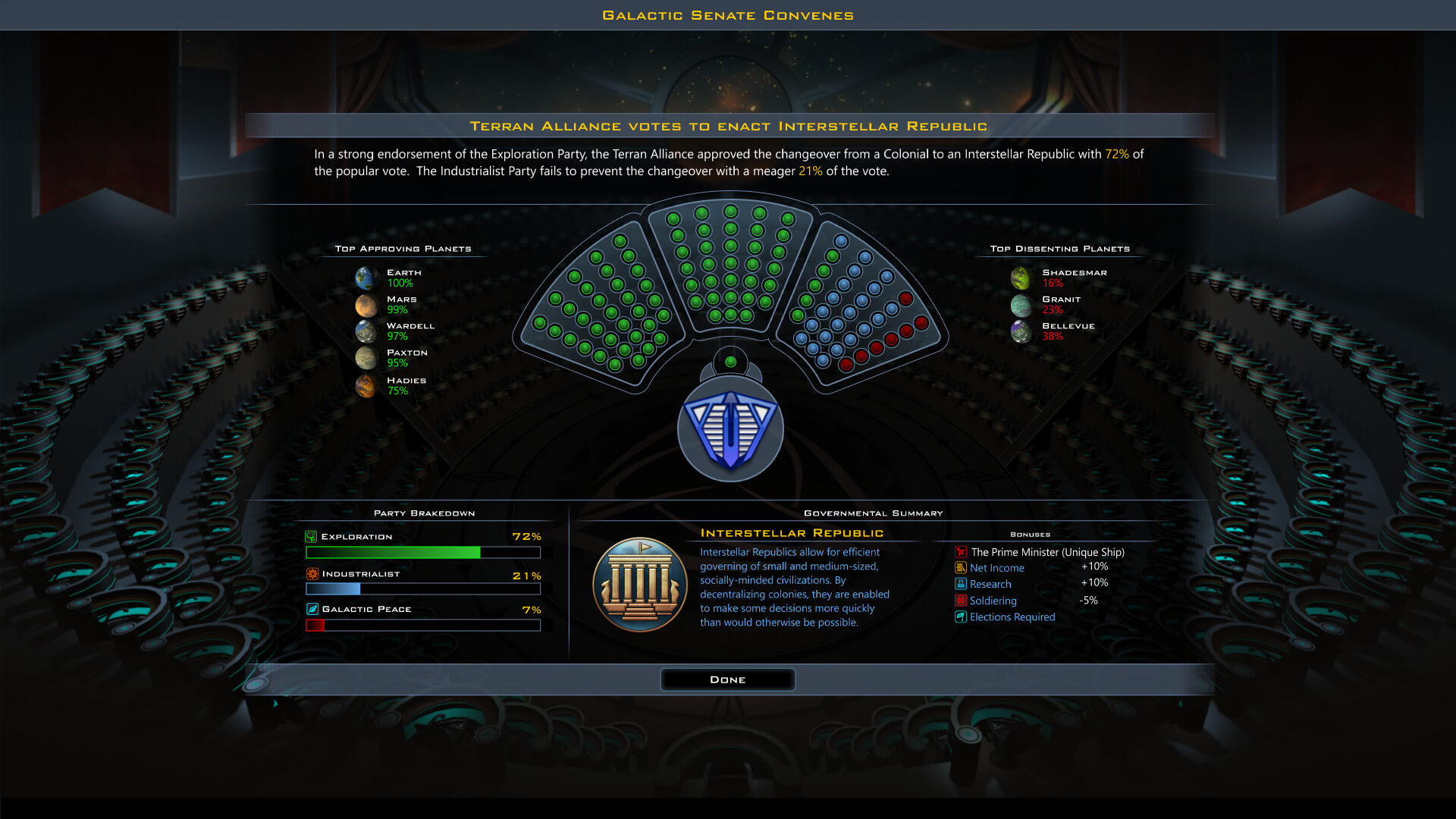 Rule with a gentle touch - or, with an iron fist! Choose from 20 available government styles and set your civilization on a path to greatness. Each style of governing has advantages and disadvantages. You can rule democratically, but you’ll need to make sure to keep the favor of your people so you don’t lose the next election. You can also adopt an Owner Aristocracy to enslave your working class, or choose an Interstellar Plutocracy and allow your corporations to rule, and then the opinions of your people don’t matter! Of course, there’s the potential for civil unrest, but you can handle that - right?