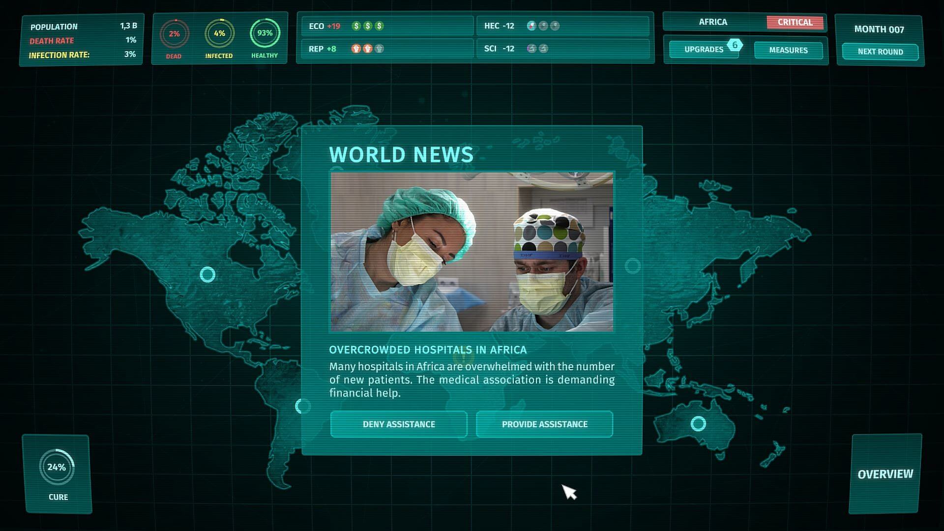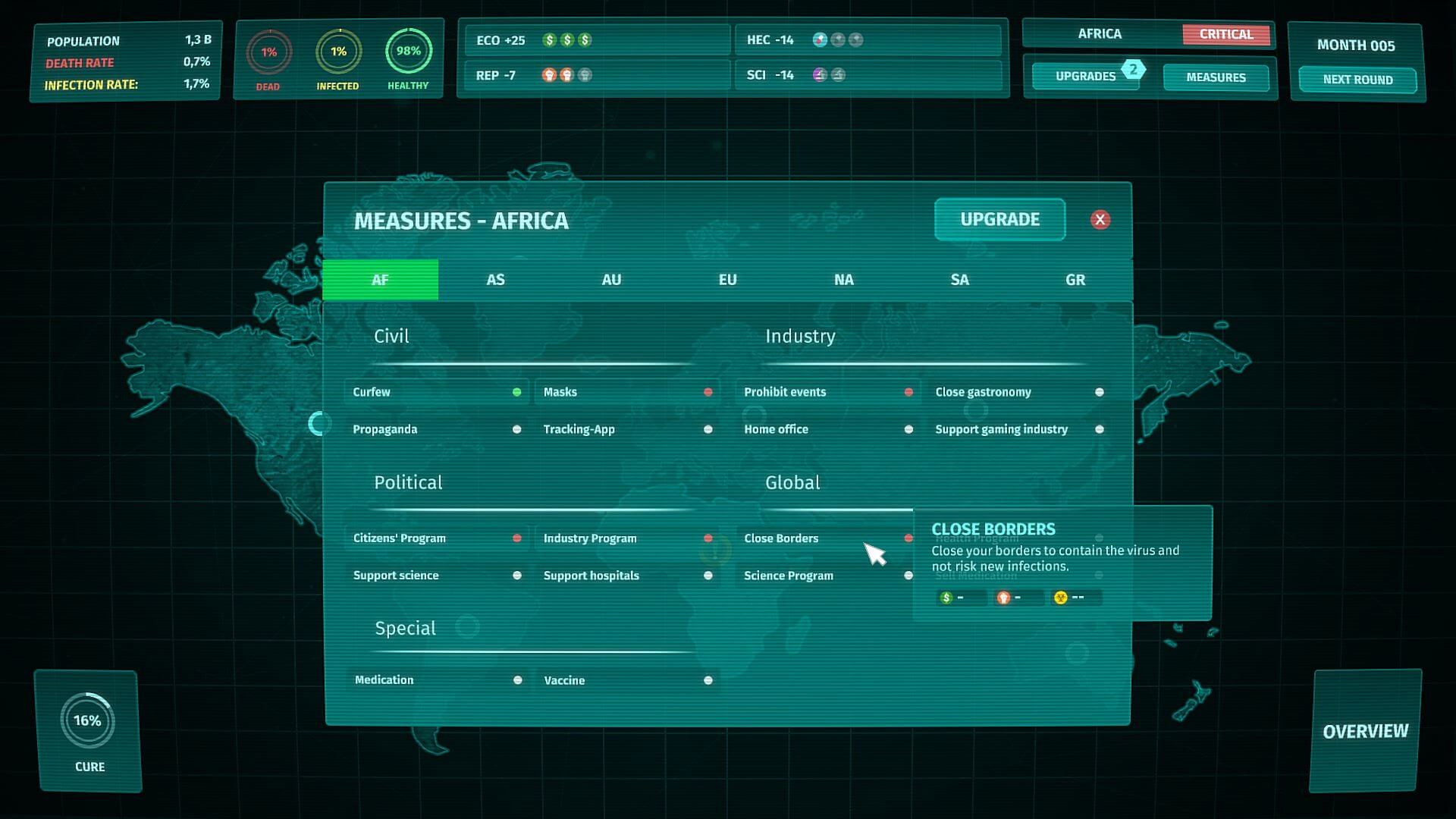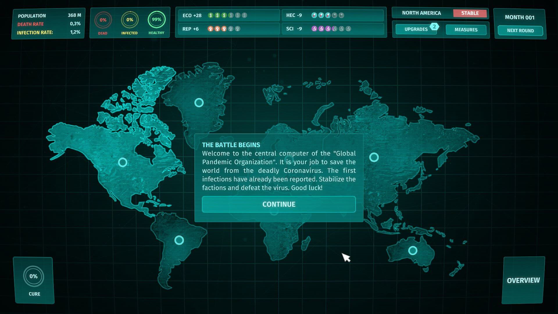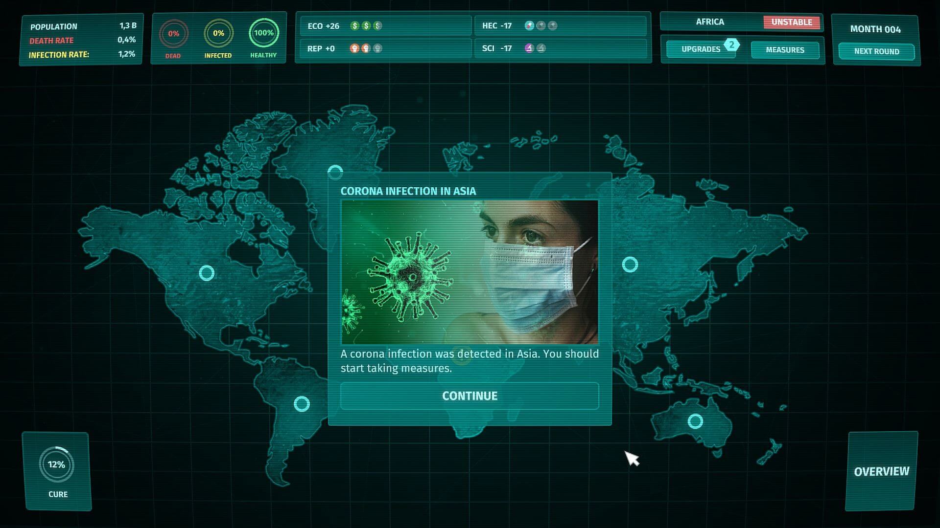 "Corona Simulator" is a sophisticated mixture of challenging strategy game and frighteningly detailed virus simulation. As a global pandemic leader, you must skillfully manage nations' resources, make tough decisions, and impose drastic measures to combat the deadly coronavirus and change the fate of mankind.