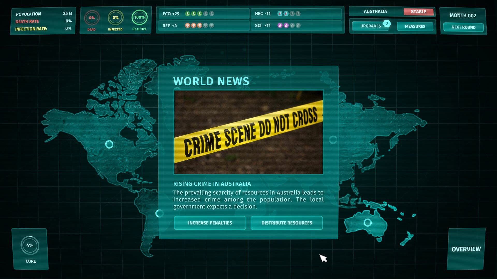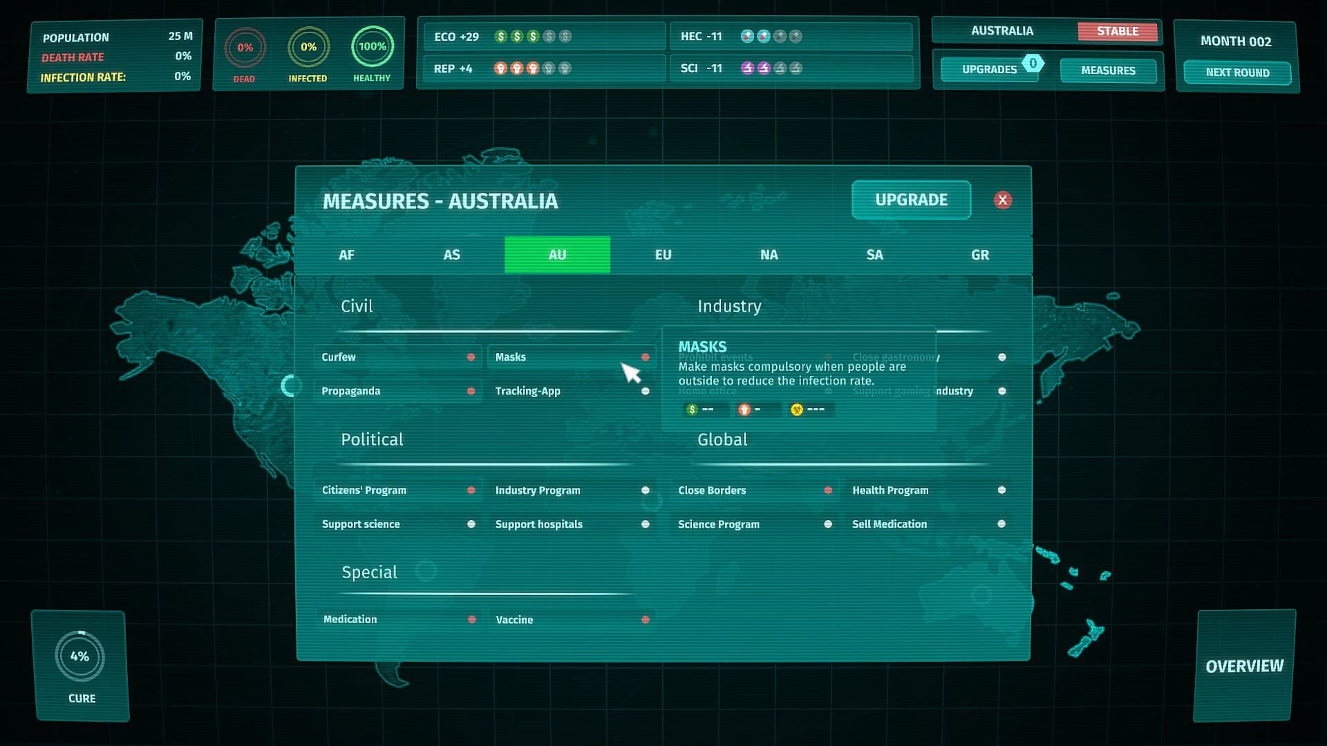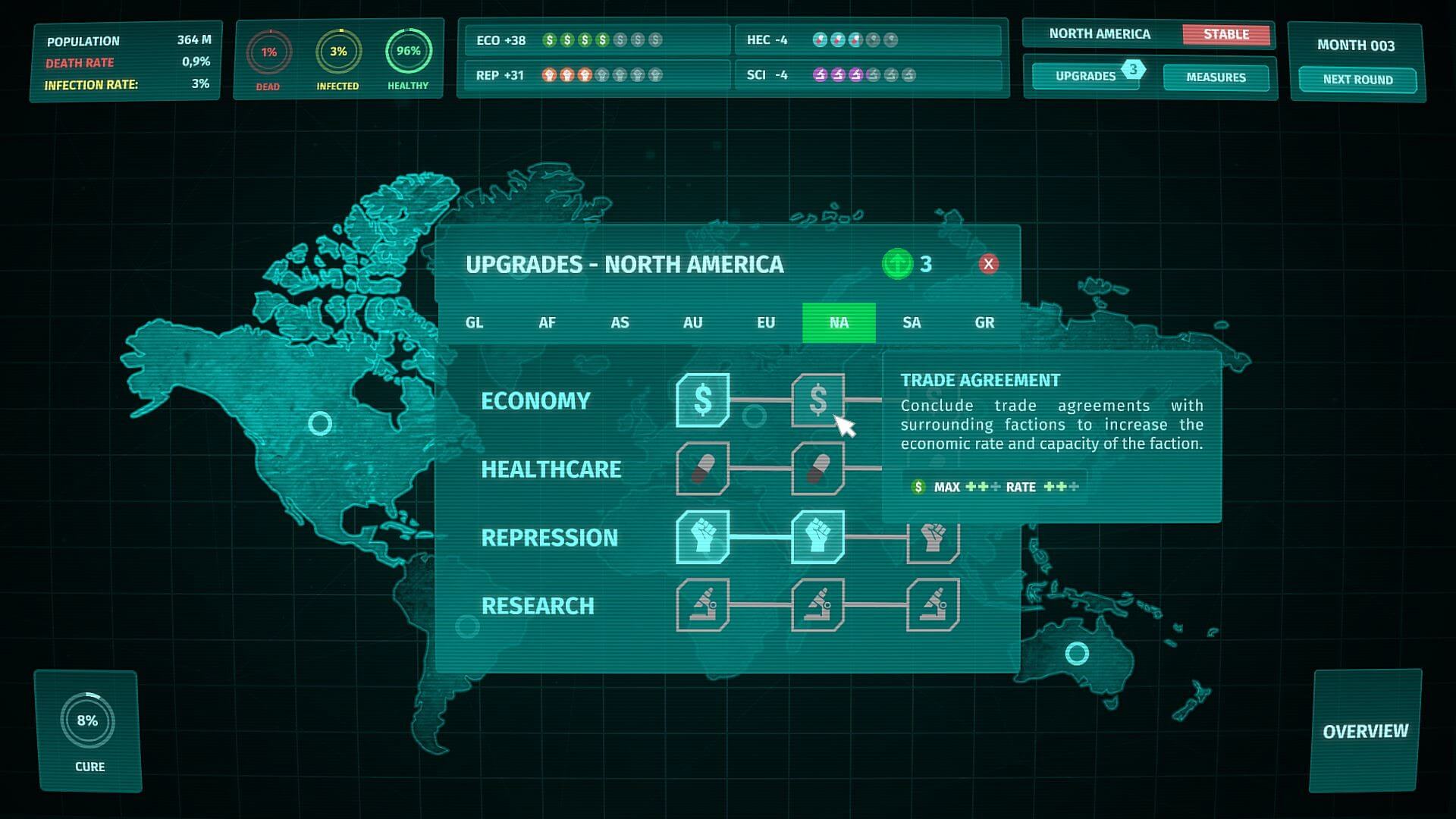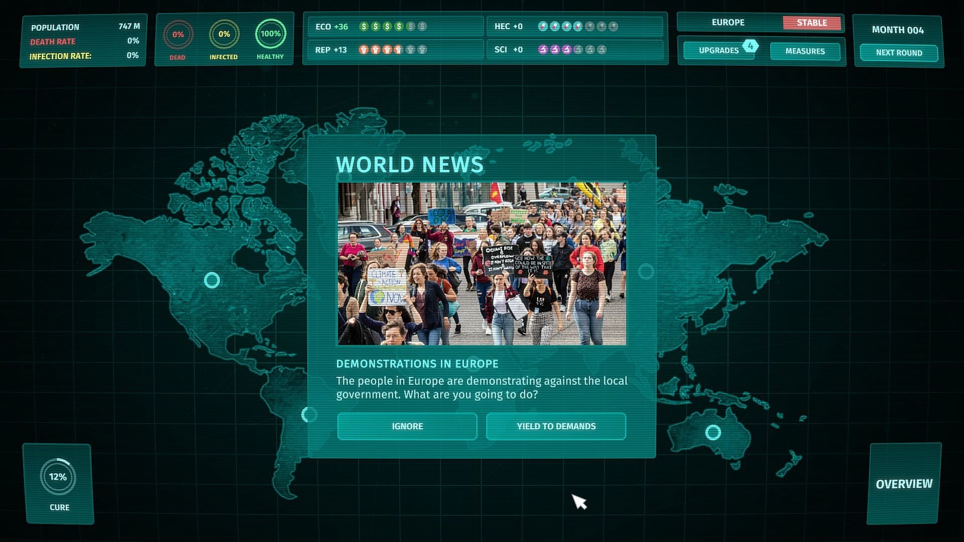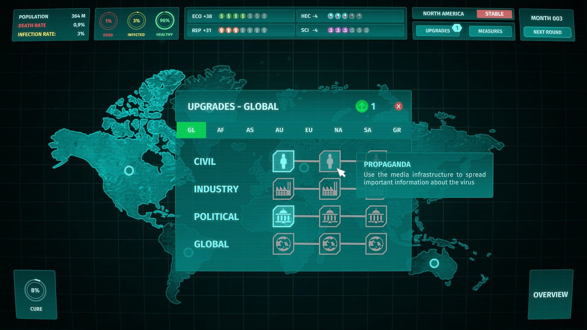 "Corona Simulator" is a sophisticated mixture of challenging strategy game and frighteningly detailed virus simulation. As a global pandemic leader, you must skillfully manage nations' resources, make tough decisions, and impose drastic measures to combat the deadly coronavirus and change the fate of mankind.