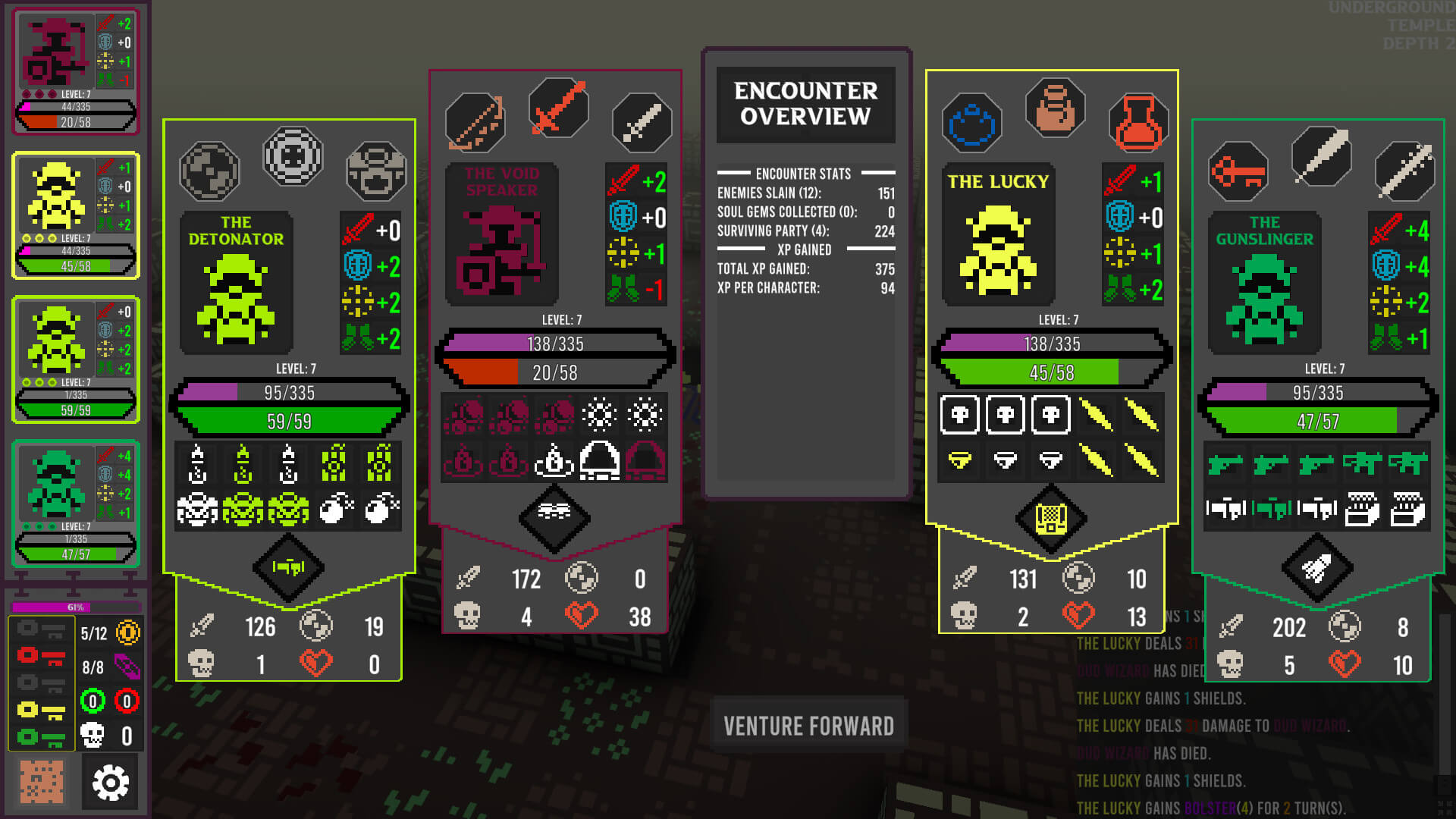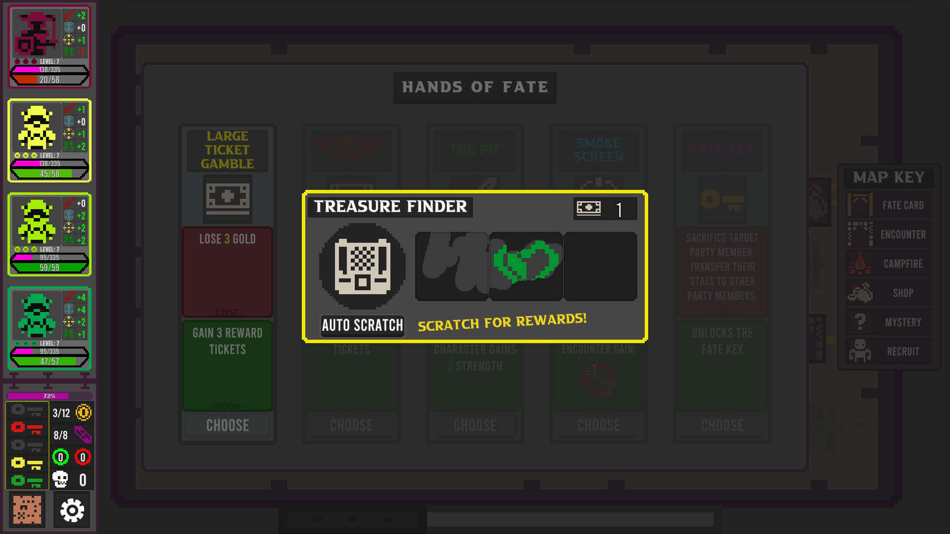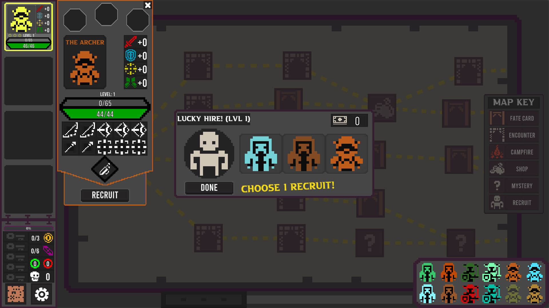 Each run of Dungeon Reels Tactics will include a pool of 12 different characters you can recruit throughout the adventure. To gain new recruits you will need to collect soul shards from fallen foes, resolve fate cards, or purchase recruit tickets in the shop. If a party member falls in battle they will die and you will need to recruit a party member for the adventure.